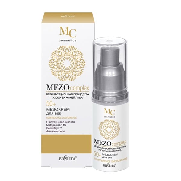 Мезокрем для век восстанавливает оптимальный уровень увлажненности кожи век, усиливает микроциркуляцию, уменьшает припухлости и темные круги под глазами, подтягивает кожу век и разглаживает морщины вокруг глаз. Matrigenics.14Gактивирует 14 генов, участвующих всинтезе коллагена, эластина игиалуроновой кислоты, уменьшает морщины через 14 дней ежедневного применения. Beautifeyeподтягивает кожу век, разглаживает морщины вокруг глаз, уменьшает припухлости и темные круги под глазами. Гиалуроновая кислота направленного действия проникает вглубокие слои эпидермиса, обеспечивает видимый эффект разглаживания морщин путем выталкивания их изнутри, оказывая действие подобное салонной процедуре мезотерапии. Коктейль из аминокислот (таурин, глицин, аргинин) наполняет клетки кожи энергией и жизненной силой, способствует клеточной регенерации. ВНИМАНИЕ: активная формула возможно пощипывание.