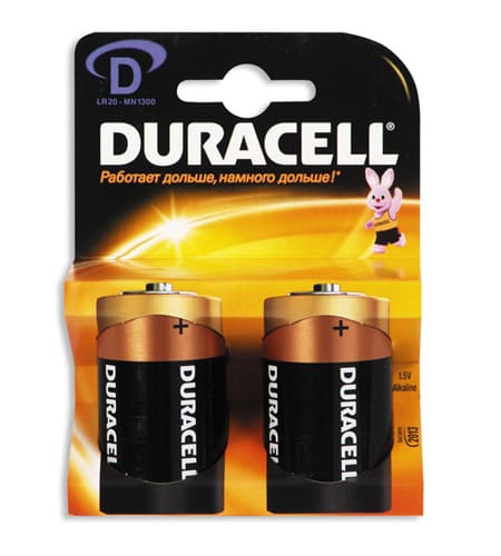 Элемент питания Duracell LR20. Типоразмер: D. Тип электролита: алкалиновая. Срок хранения: 7 лет. Напряжение: 1.5 V. Предназначены для работы в устройствах с повышенным потреблением тока. Это могут быть такие приборы: как электробритвы, фотовспышки, портативные радиостанции, плееры и диктофоны, магнитофоны, переносные телевизоры, игрушки с мотором, мощные фонари.Батарейки для продуктов с низким и средним потреблением энергии. Продукт Duracell® – один из лучших на рынке щелочных элементов питания по продолжительности использования и соотношению цены и качества. Работают до 10 раз дольше, чем обычные солевые батарейки. Надежный источник энергии на каждый день.Внимание: внешний вид изделия может отличаться от иллюстраций, представленных на сайте! При необходимости уточняйте у менеджера