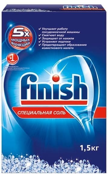 Специальная соль дляпосудомоечных машин Finish защищает вашупосудомоечную машину от известкового налета. Отложения известимогут отразиться на эффективности работы вашей посудомоечной машины. СольFinish имеет 5 мощных функций и состоит из очищенной соли, специальногранулированной для использования в посудомоечной машине. Очищенная соль обеспечивает защиту вашей посудомоечной машиныот известкового налета, что также помогает предотвратить образование пятен иводных подтеков на вашей посуде.Улучшает работу посудомоечной машины. Способствует смягчению воды. Защищает от накипи. Предотвращает образование подтеков. Предотвращает образование известкового налета.