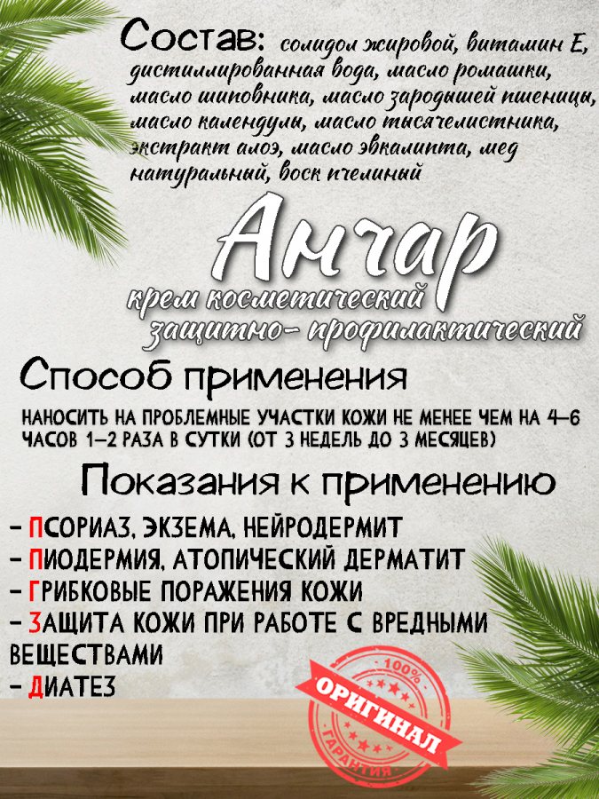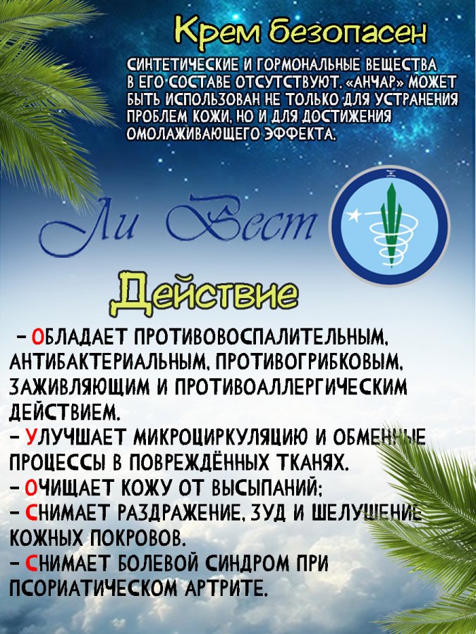 Анчар – крем специального назначения, изготовленный по древнему русскому рецепту на основе натуральных масел и лекарственных трав с помощью новейшей современной щадящей технологии. Крем обладает противоаллергическим, противовоспалительным, противогрибковым и ярко выраженным заживляющим действием при псориазе, нейродермите, грибковом поражении кожи, дерматите.