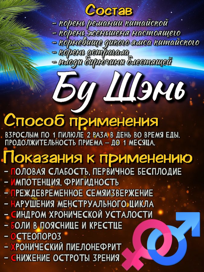 «Бу Шэнь» - уникальные пилюли, имеющие функцию эффективного восстановления в традиционной медицине Китая. Данные пилюли укрепляют естественным образом мочеполовую систему и почки, сосуды и артерии нижних конечностей, костную ткань. Кроме этого «Бу Шэнь» укрепляют потенцию. Пилюли замечательно убирают симптомы боли и тяжести в крестце и пояснице, слабость ног. У мужчин «Бу Шэнь» предотвращает преждевременную эякуляцию. Натуральные пилюли повышают физическую и умственную работоспособность, и общий тонус организма.
