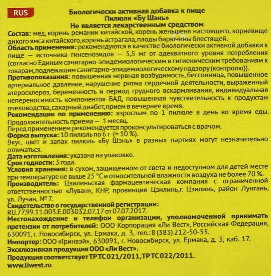Производитель: Харбинский третий фармзавод по выпуску китайских тонизирующих продуктов, КНР, г. Харбин, район Даовай, ул. Сяобачжань, 12.