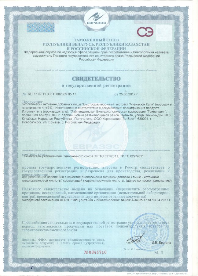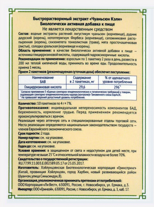 Изготовитель экстракта: КНР, провинция Хэйлунцзян, Хэйлунцзянская биотехнологическая корпорация «Гринспринг» г. Харбин, новый развивающийся район Шуанчэн, ул. Синьсиндун, № 8.