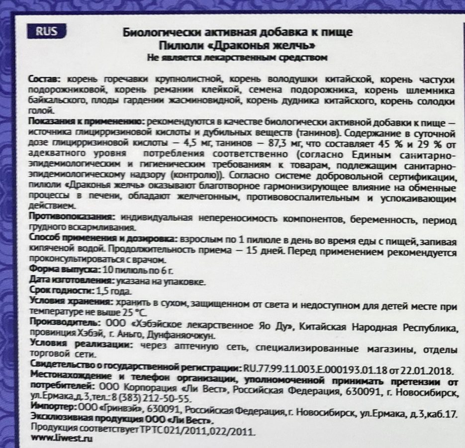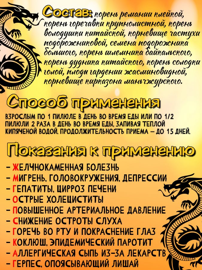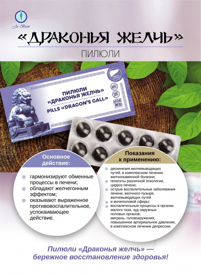 Описание и действие: классические пилюли «Драконья желчь» считаются эффективным препаратом традиционной китайской медицины, Пилюли были известны еще более 3000 лет назад. Первое оригинальное название классических пилюль китайских «Лун Дань Се Гань Вань». Это переводится дословно с китайского языка следующим образом: «пилюли, выводящие плохой жар печени с горечавкой». Данные пилюли классические гармонизируют основные обменные процессы в органе печень, а так же обладают мягким желчегонным эффектом. «Драконья желчь» оказывают выраженное обезболивающее действие, противовоспалительное, устраняют затруднения при мочеиспускании.