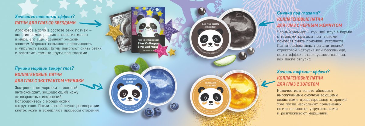 - Способствуют разглаживанию мимических морщин, помогают снять отеки и осветлить кожу под глазами. Хорошо зарекомендовали себя при длительной стрессовой нагрузке или бессоннице. Эффект отдохнувшего взгляда, как после отпуска.