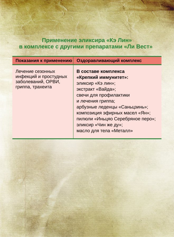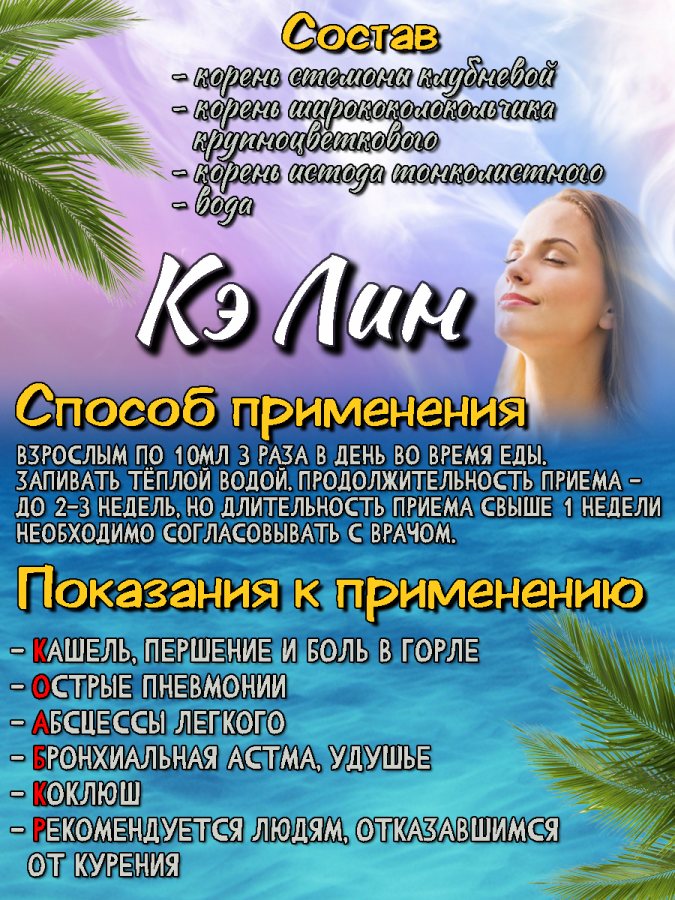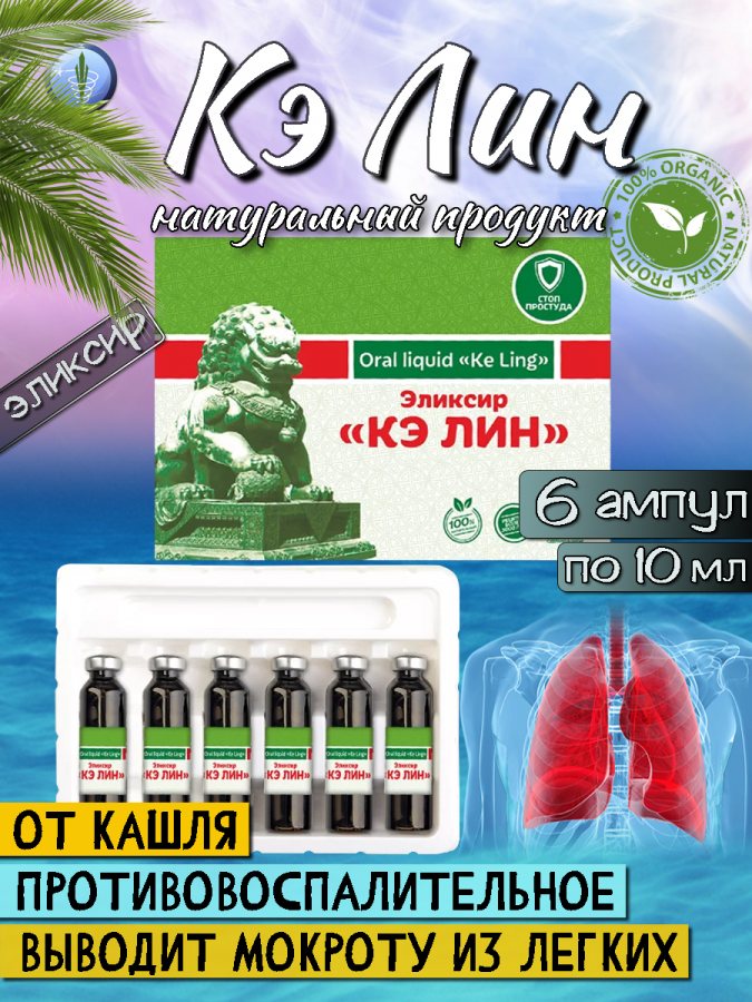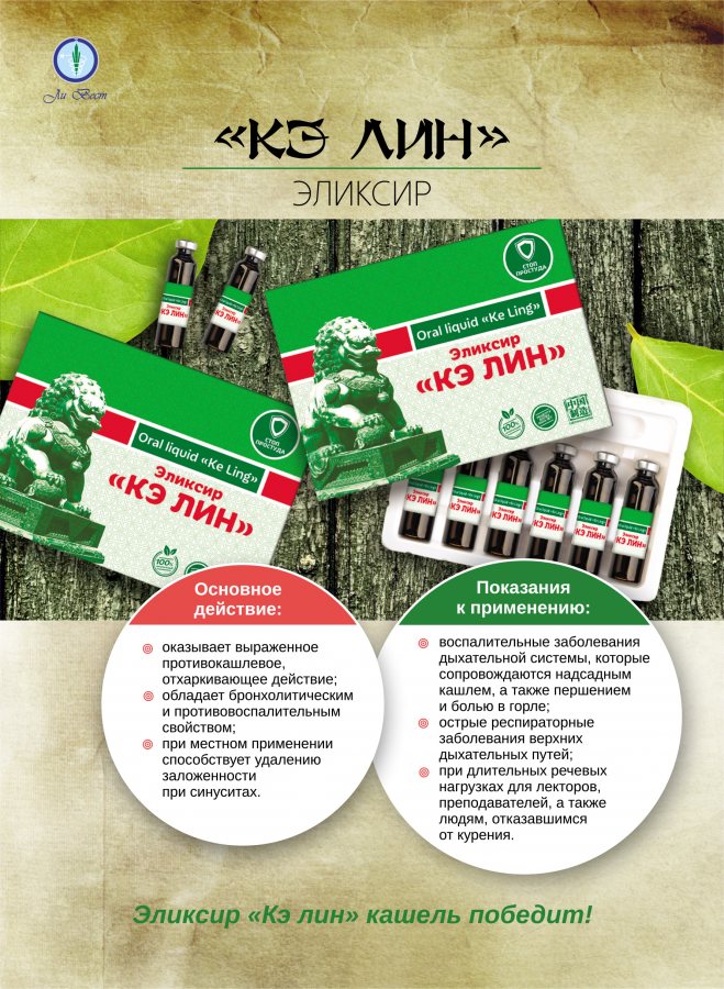 Эликсир «Кэ Лин» в древней медицине Китая занимает раздел – высокоэффективные противокашлевые средства, считаясь одним из самых популярных. «Кэ Лин» полностью натуральный. Изготовлен из отличного растительного сырья по очень древнему рецепту, который был известен ещё в династии Тан. Как и любые эффективные противокашлевые средства, эликсир «Кэ Лин» обладает хорошим отхаркивающим и противокашлевым действием. Может применяться даже для детей очень раннего возраста. «Кэ Лин» не производит подавление дыхательного центра. Облегчает выведение и разжижение мокроты. Препарат уменьшает спазм бронхов, расширяя их, местно применяется для выведения слизи, имеет противовоспалительное воздействие. По традиционной медицине Китая «Кэ Лин» способствует увлажнению легких, прекращению кашля, выводу мокроты и гноя, рассеиванию уплотнений, успокоению духа сердца и уничтожению паразитов.