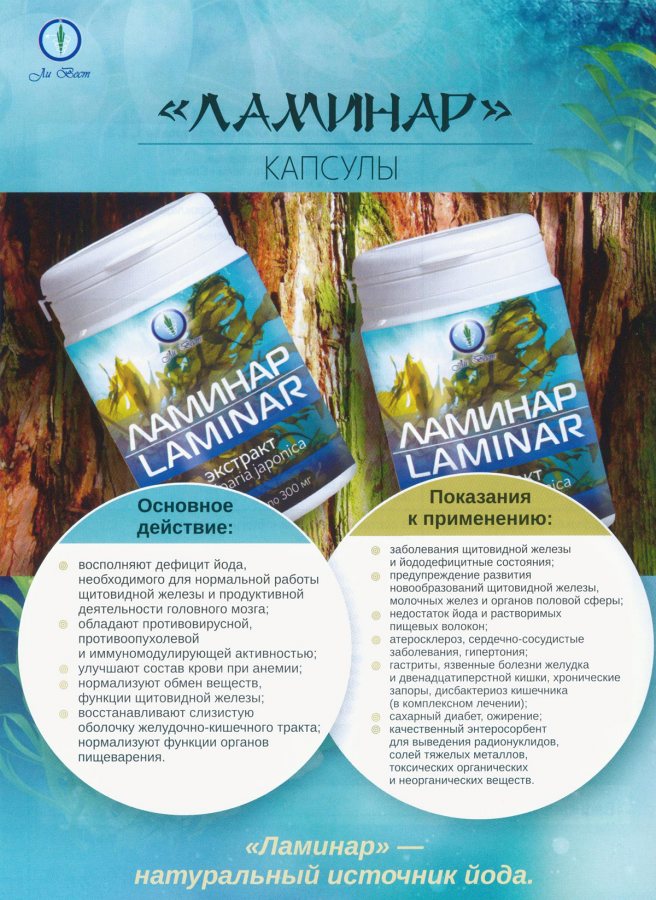 Капсулы «Ламинар» - натуральный йодсодержащий препарат, класс бурых морских водорослей, необходимый человеку для нормальной работы его организма.