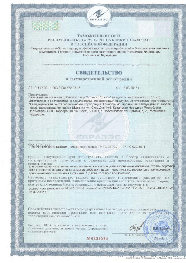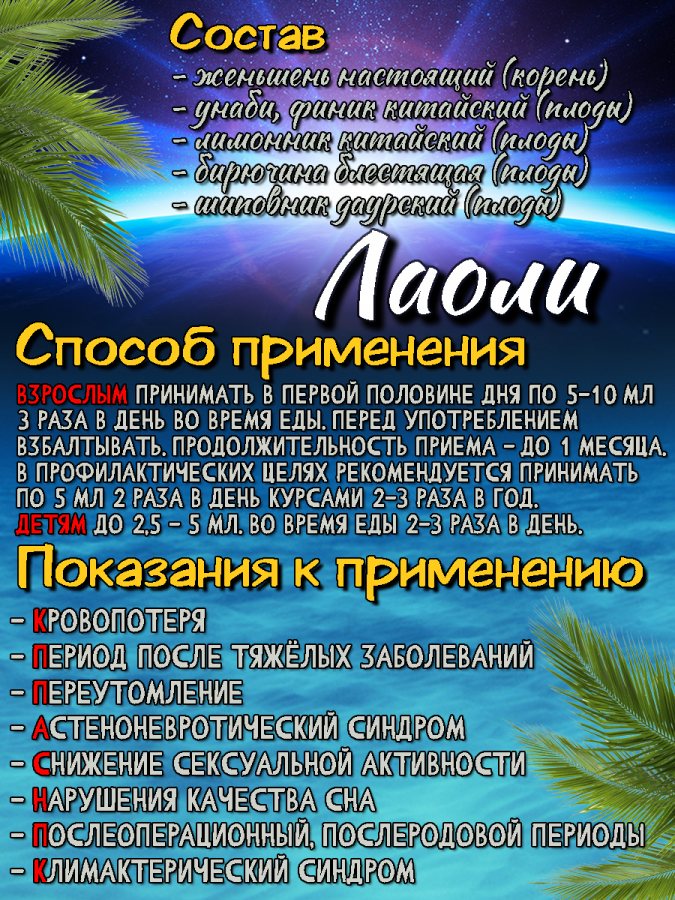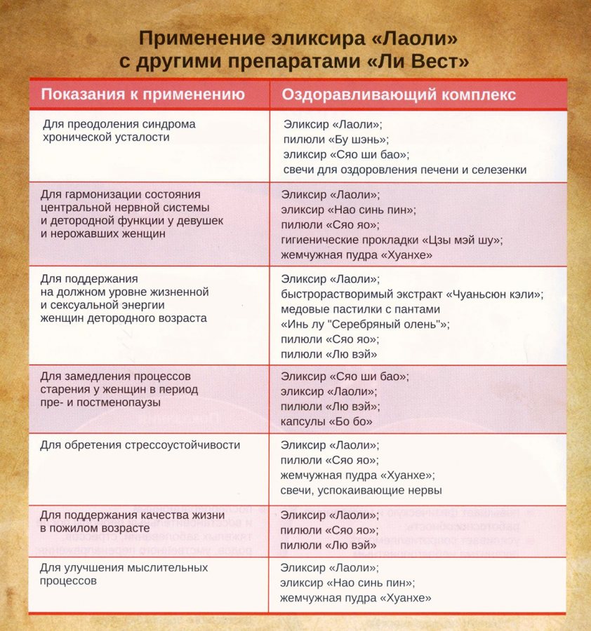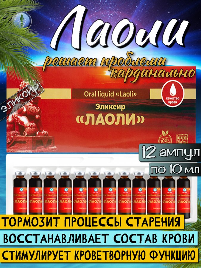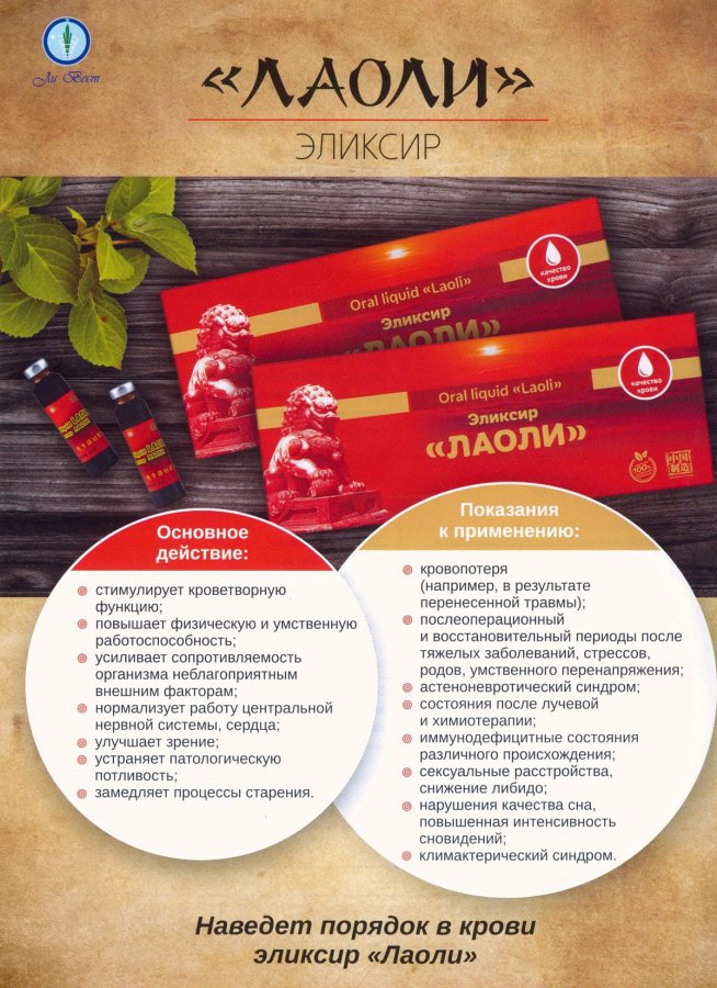 Эликсир китайский «Лаоли» уникален тем, что находит кардинальные решения отвечающие за здоровье женщины и здоровье мужчины. У женщин он нормализует кровь в целом, а у мужчин стабилизирует гормональный баланс, являясь отличным средством для профилактики аденомы простаты и простатита в целом. «Лаоли» стимулирует функцию кроветворения и эффективно восстанавливает естественный состав крови. Хорошо повышает умственную работоспособность, эффективно усиливает физическую работоспособность, повышает общую сопротивляемость организма к инфекциям и внешним отрицательным воздействиям(увеличивает устойчивость к кислородному голоданию и холоду). Оказывает нормализующее воздействие на работу сердца, ЦНС, улучшает качество сна и зрения. «Лаоли» способствует устранению патологической потливости, шума в ушах, неврастении, головокружения. Благотворно влияя на здоровье женщины и естественное здоровье мужчины, данный эликсир, кроме выраженного оздоровительного воздействия используется для поддержания долголетия и профилактики заболеваний в целом.