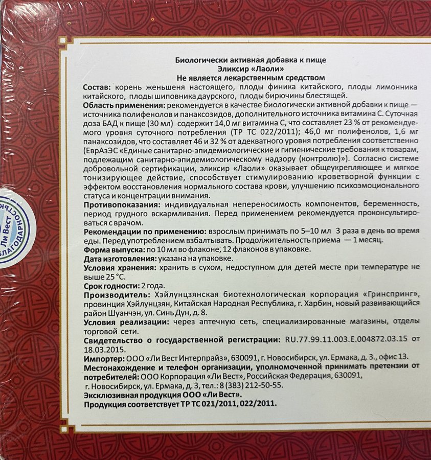 Ли Вест Лаоли эликсир для стимуляции кроветворной функции, для сердца, зрения, против шума в ушах