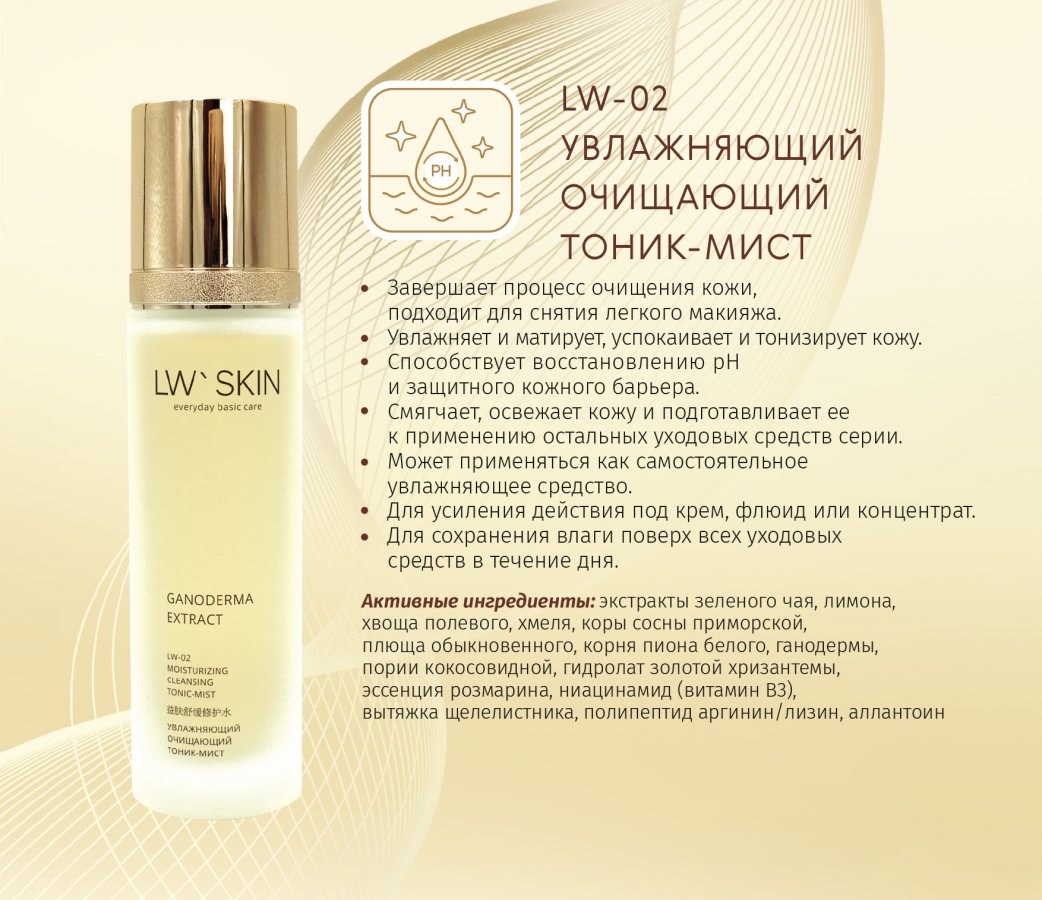 Увлажняющий тоник-мист для кожи любого типа и возраста, быстро восстанавливает защитный кожный барьер. Используется в качестве второго этапа очищения после LW-01 Очищающее увлажняющее молочко. Оба средства отлично дополняют друг друга.