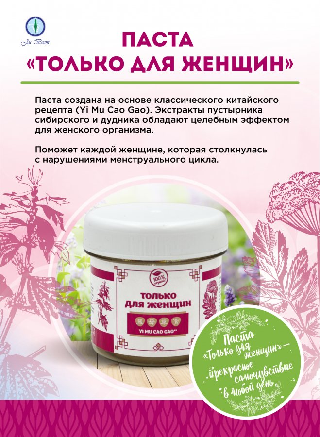 Паста создана на основе классического китайского рецепта (Yi Mu Cao Gao). Экстракты пустырника сибирского и дудника обладают целебным эффектом для женского организма. Собранные воедино и переработанные по особой технологии ТКМ, они дают мощную защиту женскому организму.