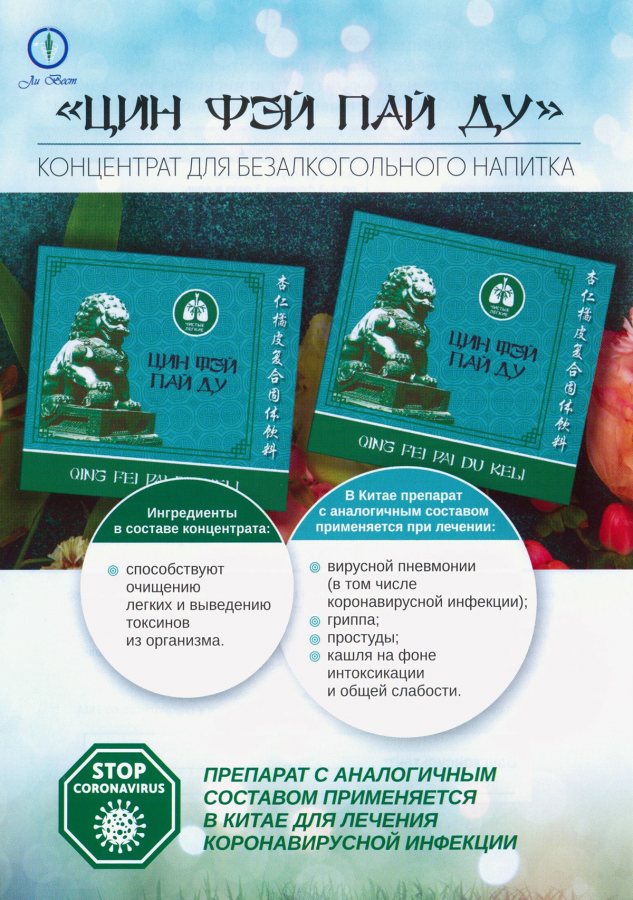 Концентрат «Цин Фэй Пай Ду» - способствует устранению поражений бронхолегочной системы. Используется при пневмонии, в том числе вирусной. Способствует очищению легких и выведению токсинов из организма. Успешно применяется в Китае при лечении COVID-19.