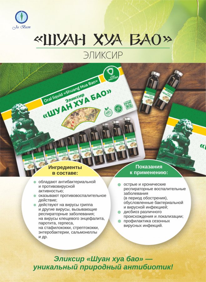 Эликсир «Шуан Хуа Бао» - антибиотик, созданный самой природой. Его можно применять, не назначая классические антибиотики. Отлично поддаются лечению такие заболевания как хроническая ангина, паротит, клещевой энцефалит, герпес, вирусы сальмонеллы. То есть заболевания, обусловленные любыми вирусными инфекциями и респираторными бактериальными инфекциями.