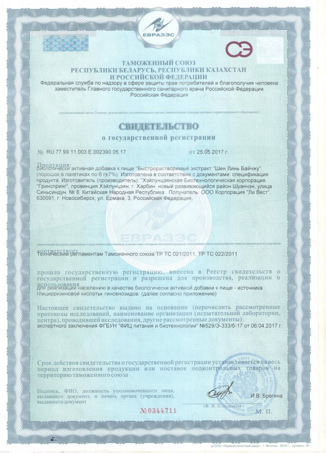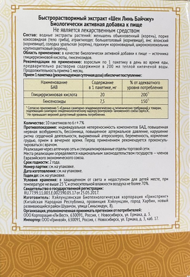 Изготовитель: КНР, провинция Хэйлунцзян, г. Харбин , Хэйлунцзянская биотехнологическая корпорация «Гринспринг», новый развивающийся район Шуанчэн, ул. Синьсиндун, № 8.