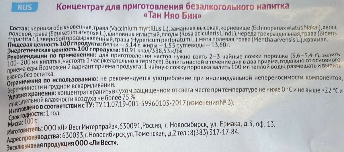 - 2) Насыпать в стакан 1 чайную ложку концентрированного порошка, залить теплой водой в количестве 100мл. Интенсивно размешать и выпить залпом. Принимать концентрат «Тан Няо Бин» следует в два приема, в течение дня. Прием производить между приемами пищи.