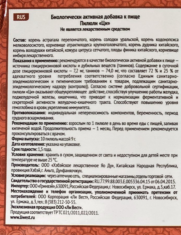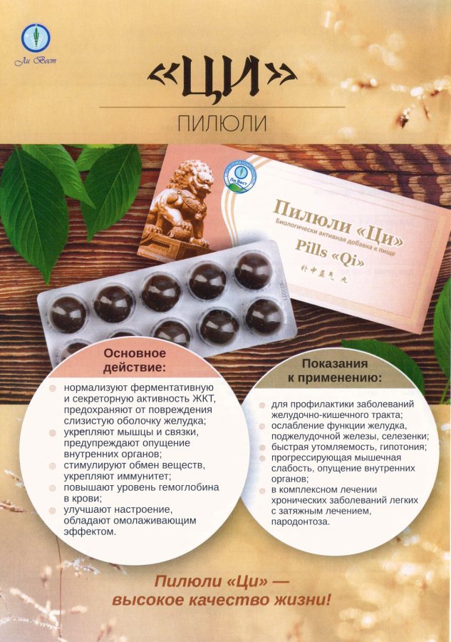 Пилюли по праву считаются сокровищем древней медицины Китая. Оказывая мягкое влияние на все восстановительные процессы ЖКТ, своим действием производят улучшение пищеварения. Стимулируя общий обмен веществ, повышая уровень гемоглобина, восстанавливая иммунитет, пилюли «Ци» при системном употреблении оказывают ярко выраженное влияние на омоложение клеток организма в целом.