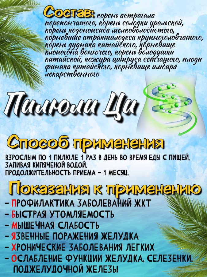 Основой всей древней китайской фармакологии считаются пилюли «Ци». Эти пилюли естественным образом улучшают и отстраивают работу желудка, кишечника и поджелудочной железы. «Ци» нормализуют секреторную и ферментативную активность ЖКТ, и замечательно предохраняют от повреждений слизистую оболочку желудка. Пилюли укрепляют связки и мышцы, предупреждают активное опущение внутренних органов. Кроме этого способствуют укреплению иммунитета, стимуляции обмена веществ, повышению уровня гемоглобина в крови. Обладают естественным омолаживающим эффектом. Улучшают настроение. Согласно действия традиционной медицины Китая, данные пилюли поднимают опущенный ЯН, укрепляют средний Цзяо, а энергия Ци питает селезенку и поддерживает желудок. Пилюли помогают при слабости и усталости, затянувшейся диарее, понижении аппетита, опущении матки, вздутии живота, понижении аппетита, обезвоживании, корни которого уходят в пустоту желудка и селезенки.