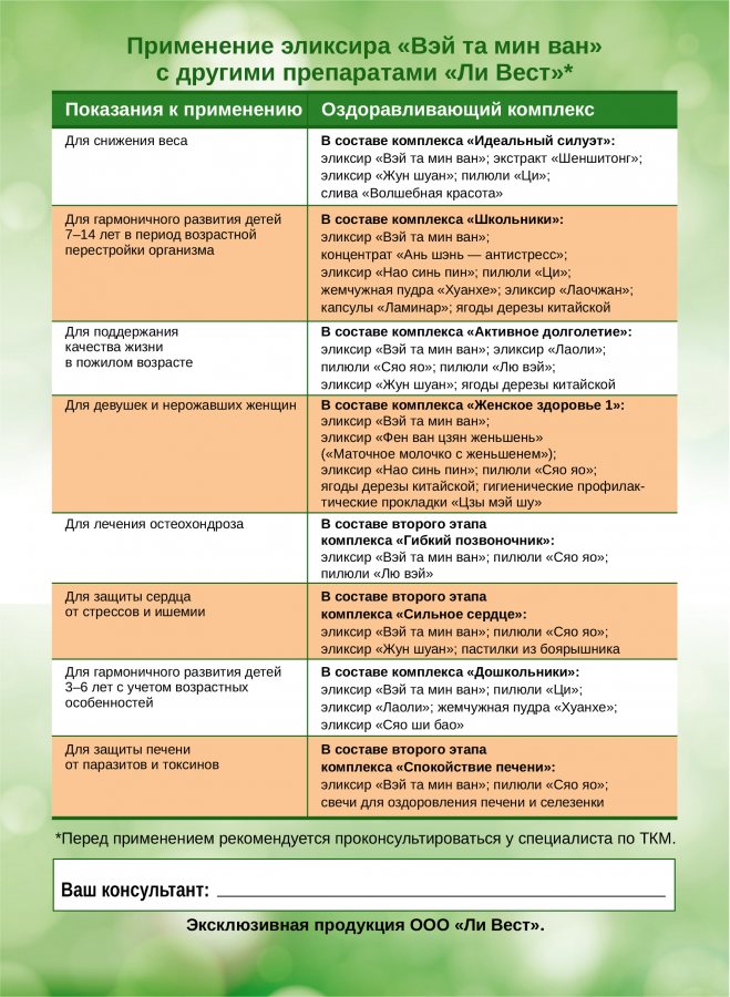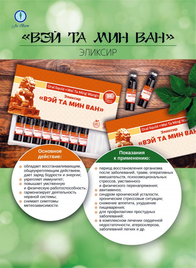 Эликсир китайский «Вэй та мин ван» считается лучшим профилактическим препаратом. Натуральный витаминно-минеральный комплекс, идеально сбалансированный с помощью научных современных технологий. «Вэй та мин ван» воздействует на организм человека как общеукрепляющий, восстанавливающий и повышающий работоспособность человека. Препарат повышает бодрость и наделяет энергией в течение дня. Кроме этого препарат действует как природный имуномодулятор и гармонизатор умственной деятельности человека, улучшает ночное качество сна и поднимает настроение. Мягкий природный антиоксидант. Отлично снимает симптомы метеозависимости различной тяжести. Обладает мягким слабительным воздействием , является натуральным противокашлевым эликсиром. Повышает физическую, эмоциональную и умственную работоспособность, выстраивает естественную защиту от радио и химиотерапии. «Вэй та мин ван» питает энергией Ци желудок, селезенку, сердце, легкие. Успокаивает дух, увлажняет толстый кишечник и легкие.